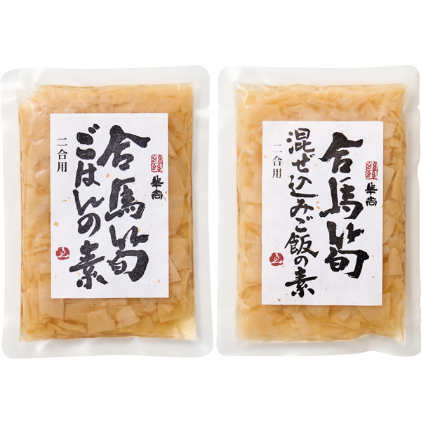保水力のある粘土質の赤土の大地で育ち、アクが少なく香り、味、歯ごたえに優れ一流料亭でも指名される合馬の筍。その風味がごはんにしっかりしみ込む炊き込みご飯と、筍のしゃきしゃきとした食感が楽しめる混ぜ込みご飯の素をお届け。本格的な筍ごはんの素をお楽しみください。