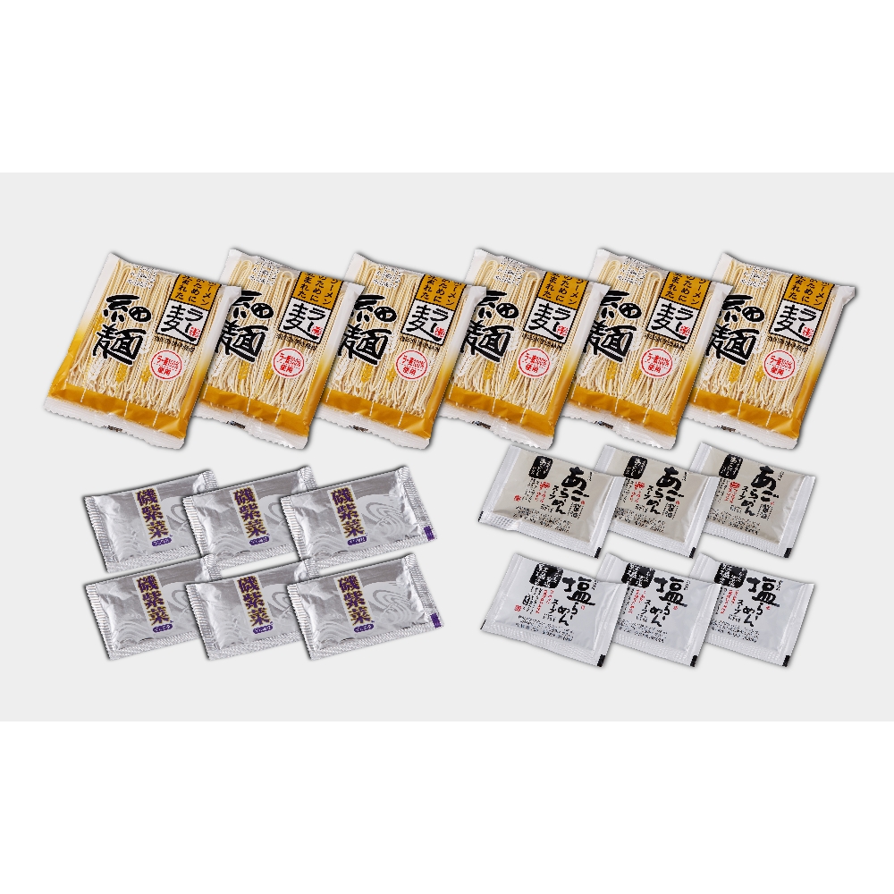 内容:ラー麦麺80g×6、あごだし醤油スープ40g×3、岩塩スープ36g×3、磯紫菜0.3g×6