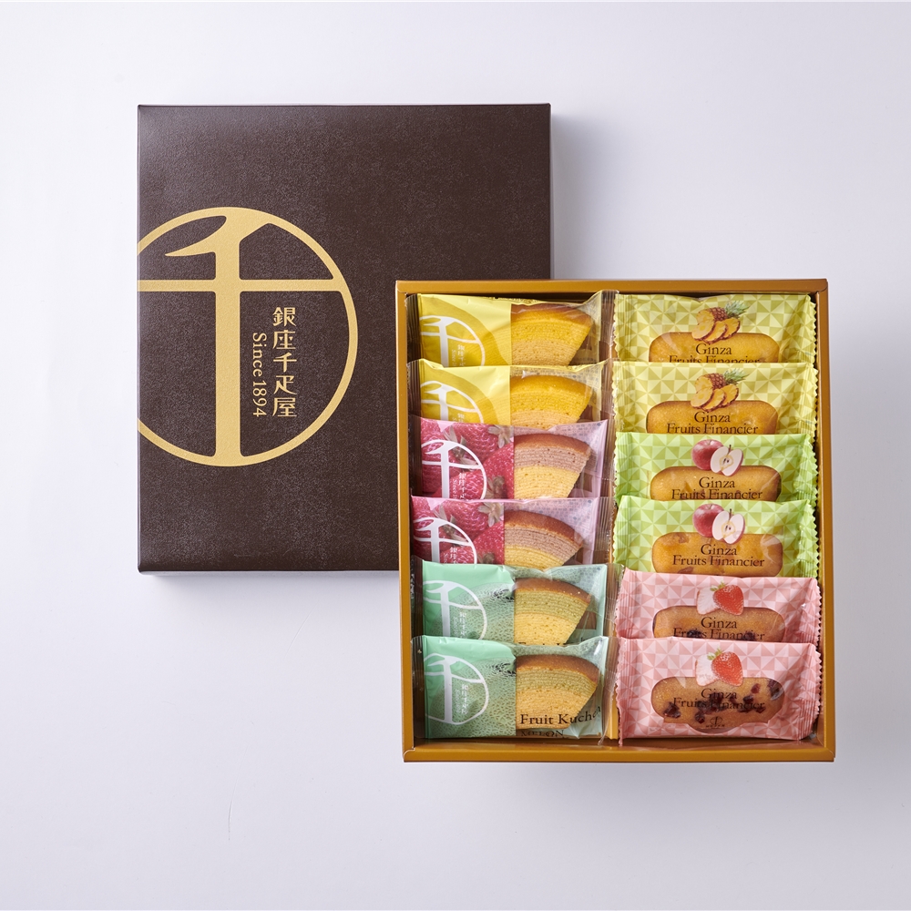 内容:銀座フルーツクーヘン (メロン&ミルク、イチゴ&ミルク、レモン&はちみつ) 3種各2個、銀座フルーツフィナンシェ (パイナップル、ストロベリー、アップル) 3種各2個