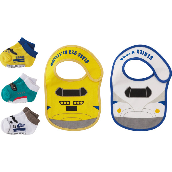 新幹線をモチーフにしたソックスとビブセットです。[てちゅした]は新幹線車両を立体的にデザインしたベビーサイズのソックスセットで滑り止め加工で安心して履いて頂けます。[ビブトレイン]人気車両のビブになります。外出先でも使用しやすいマジックテープ仕様です。