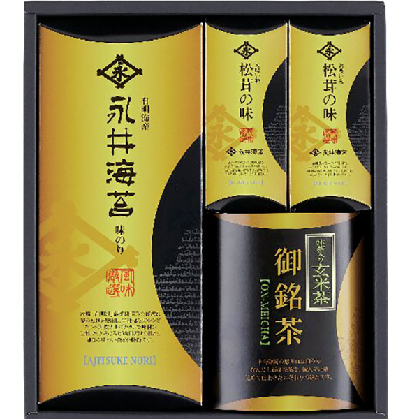 秘伝のたれで、じっくり焼き上げた永井の味付け海苔とお吸い物、玄米茶の詰合わせです。