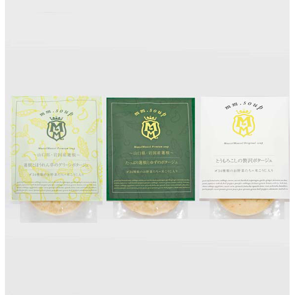 内容:蓮根とほうれん草のグリーンポタージュ180g、たっぷり蓮根とゆずのポタージュ180g、とうもろこしの贅沢ポタージュ180g