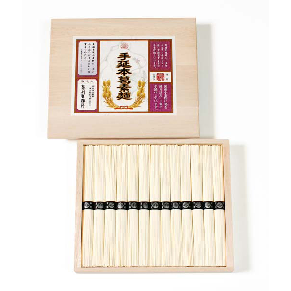国産小麦に本葛を加え、丁寧に手延べ致しました。葛入りならではのツルツルとした喉越しと、手延べによるコシの強さが自慢です。