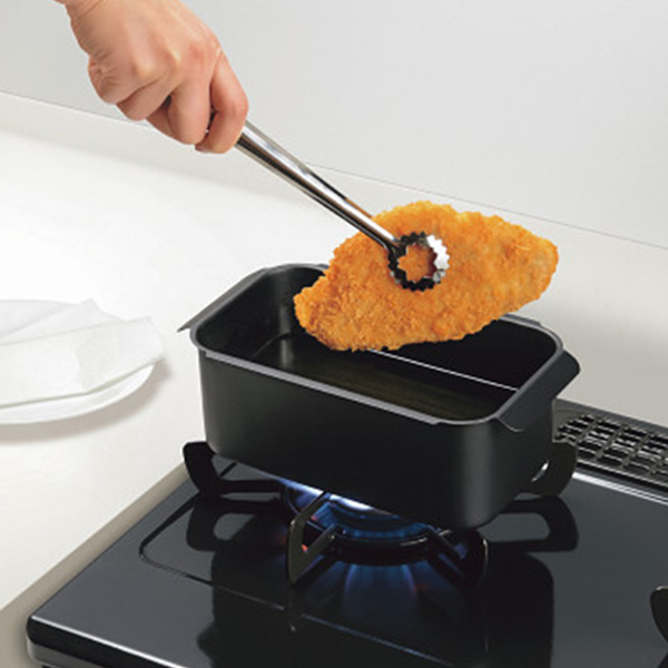 四角い揚げ物鍋は少ない油でOK!油も節約できて、収納すっきり!長方形なのでコンパクトながらも長さのある食材にも対応でき、お弁当のちょこっと揚げにも使いやすい揚げ鍋です。とんかつや天ぷら・唐揚げはもちろん、ホームパーティーで串揚げなども楽しめます。ガス火・IH対応です。