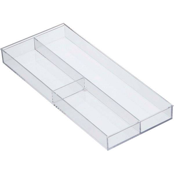 伸縮できるので、引き出しのサイズに合わせてぴったりとフィットします。上段トレーは透明なので、下が見渡せます。下段トレーは定規などの長いアイテムも収納可能です。