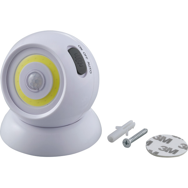 COBライトで夜でも明るく周りを照らします。コンセントがない場所でも取り付けでき明るく点灯します。人感センサー反応範囲約3m 検知幅約45度 約250ルーメン