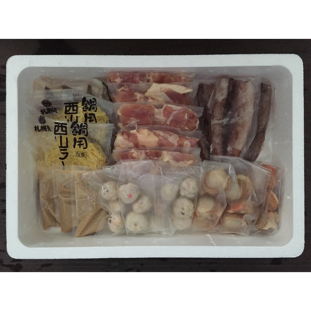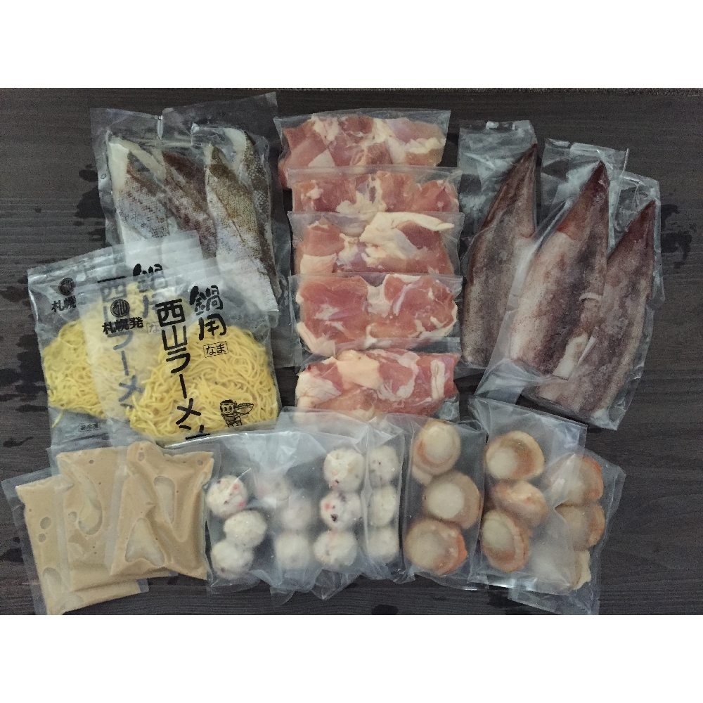 内容:北海道産鶏肉もも肉100g×5袋 、ツボ抜きいか100g×3尾、ボイル帆立 20g×9個、助宗鱈切身40g×4切、たこ入つみれ15g×12個、冷凍生ラーメン80g×2玉、たれ(濃縮:白湯仕立て)50ml×3袋
