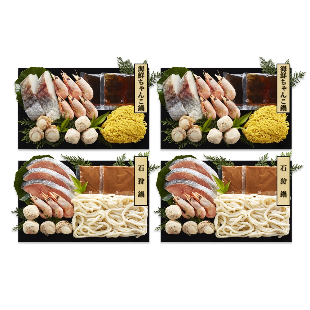 内容:個食用 石狩鍋セット(秋鮭切身40g×3切、ボイル海老6g×3尾、ボイル帆立20g×2個、えび入つみれ20g×2個、冷凍うどん250g×1玉、たれ(濃縮:味噌)50g×2袋 ※約2人前)、海鮮ちゃんこ鍋セット(助宗鱈切身40g×2切、ボイル海老6g×6尾、ボイル帆立20g×3個、かに入つみれ20g×3個、冷凍生ラーメン80g×1玉、たれ(濃縮:塩)50ml×2袋 ※1~2人前) ×各2