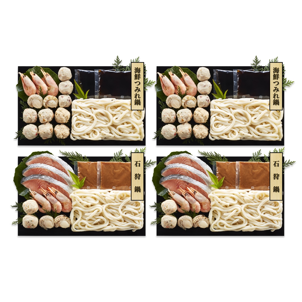 内容:個食用 石狩鍋セット(秋鮭切身40g×3切、ボイル海老6g×3尾、ボイル帆立20g×2個、えび入つみれ20g×2個、冷凍うどん250g×1玉、たれ(濃縮:味噌)50g×2袋 ※約2人前)、海鮮つみれ鍋セット(かに入つみれ20g×2個、えび入つみれ20g×2個、とりごぼうつみれ 20g×2個、たこ入つみれ15g×3個、ボイル海老6g×3尾、ボイル帆立20g×2個、冷凍うどん250g×1玉、たれ(濃縮:醤油)50ml×2袋 ※約2人前) ×各2