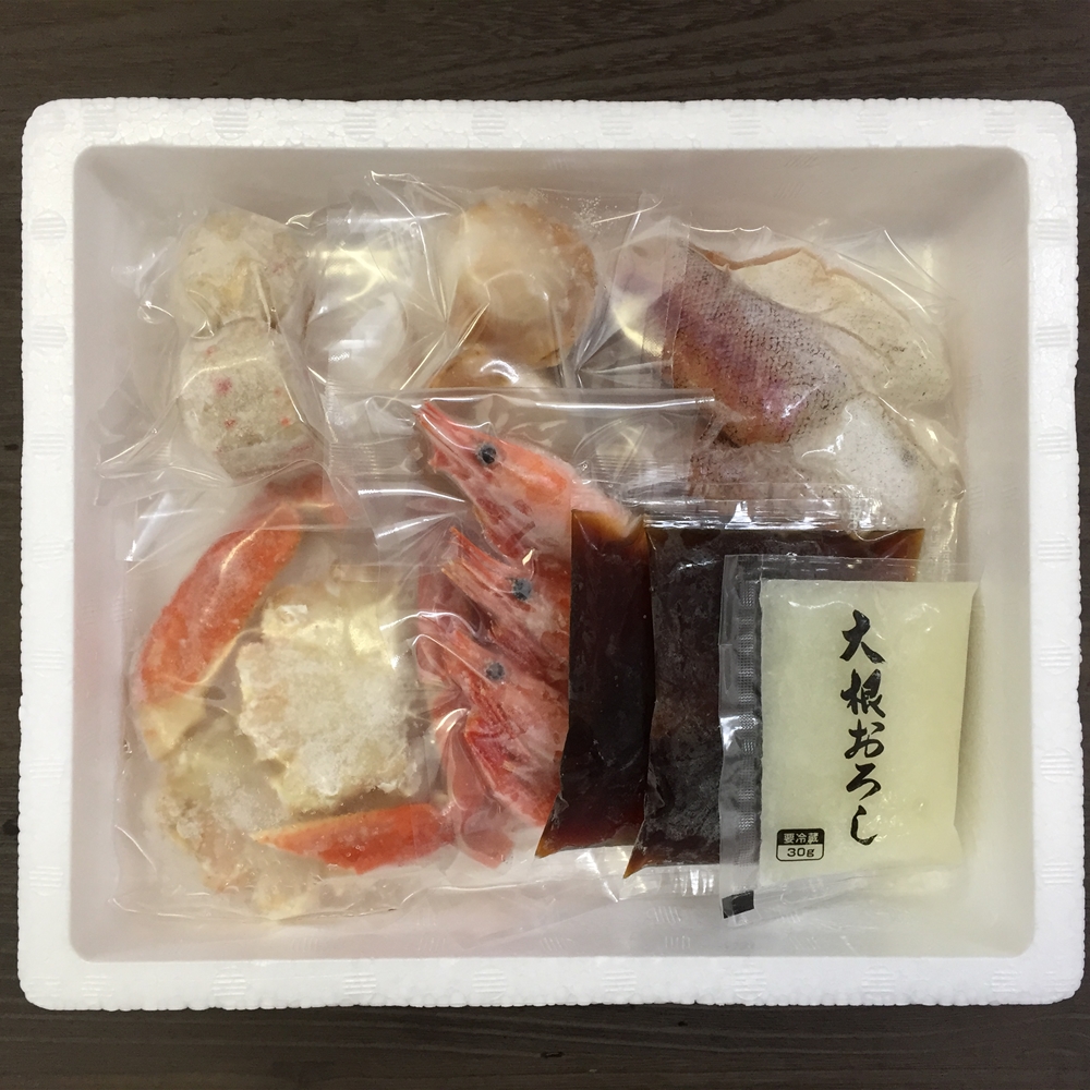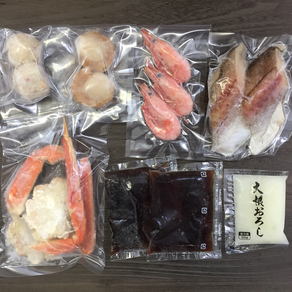 内容:ゆでずわいがにカット100g×1、ボイル海老×3、ボイル帆立×2、かに入つみれ×2、助宗鱈切身40g×2、大根おろし30g×1、たれ(濃縮醬油仕立て)50ml×2
