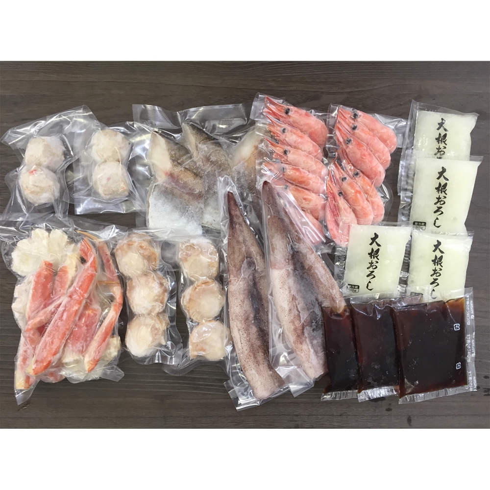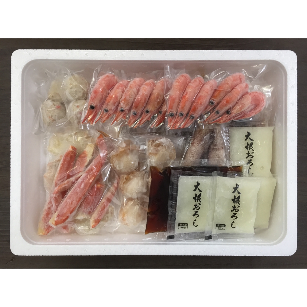 内容:ゆでずわいがにカット200g×1、ボイル海老×12、ボイル帆立×6、かに入つみれ×4、ツボ抜きいか100g×2、助宗鱈切身40g×3、大根おろし30g×4、たれ(濃縮醬油仕立て)50ml×3