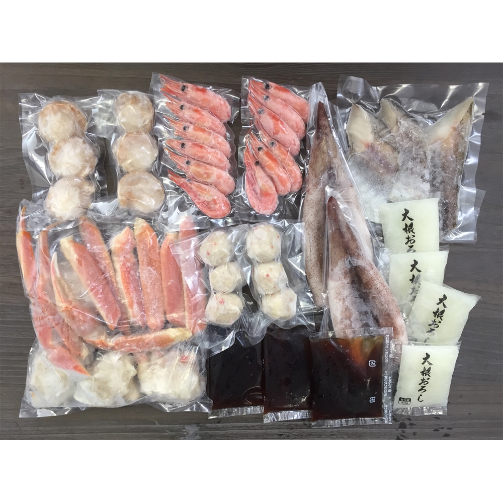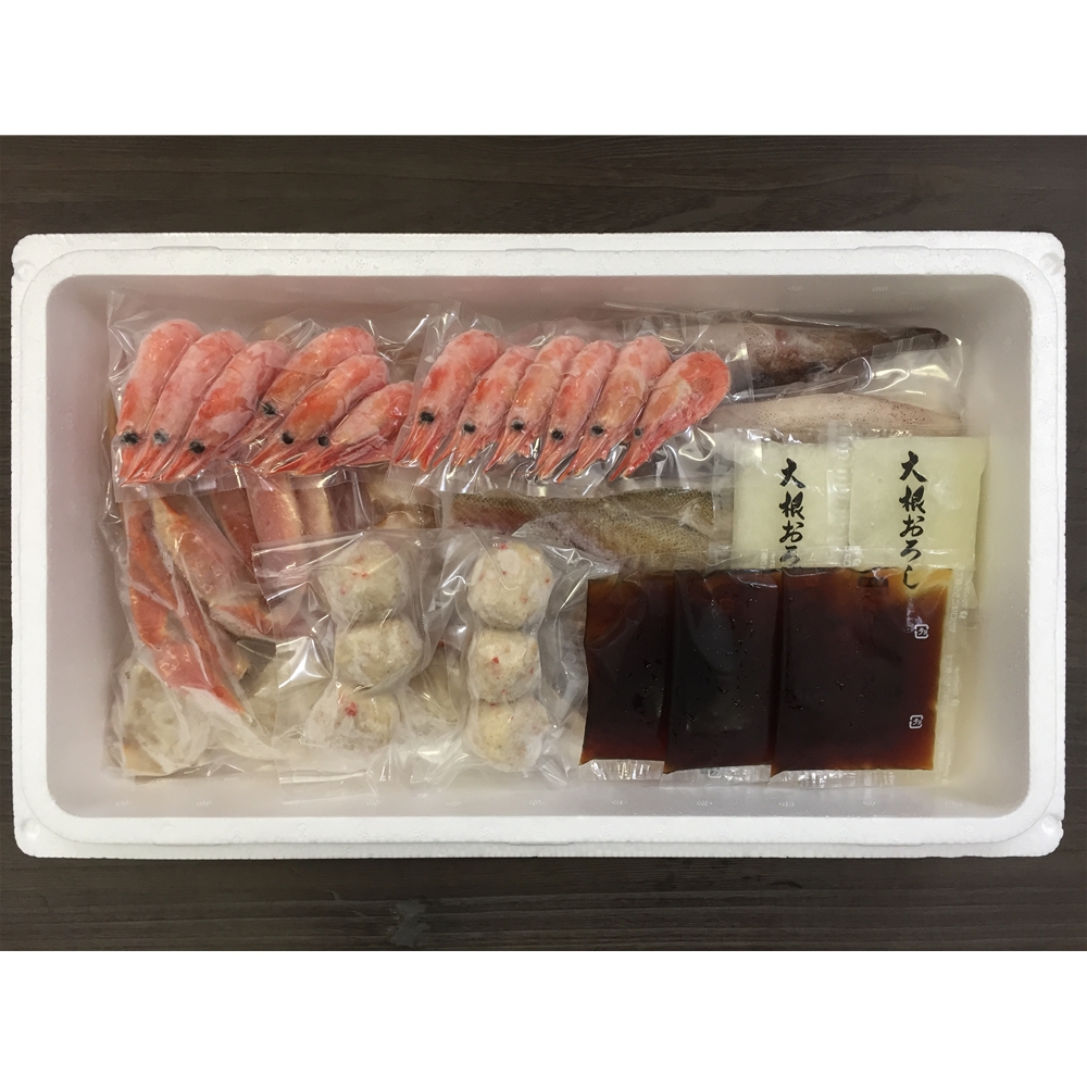 内容:ゆでずわいがにカット300g×1、ボイル海老×12、ボイル帆立×6、かに入つみれ×6、ツボ抜きいか100g×2、助宗鱈切身40g×3、大根おろし30g×4、たれ(濃縮醬油仕立て)50ml×3