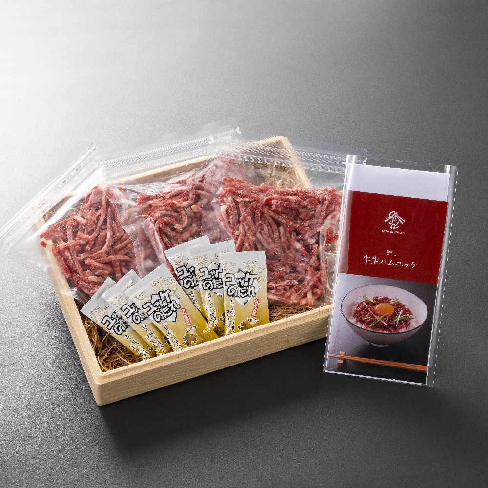 内容:黒毛和牛生ハム細切り300g(100g×3)、ユッケダレ120g(20g×6)