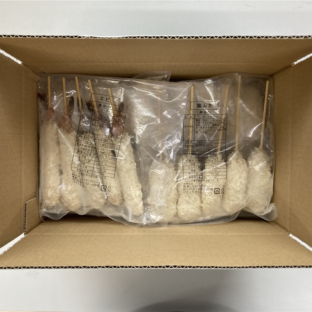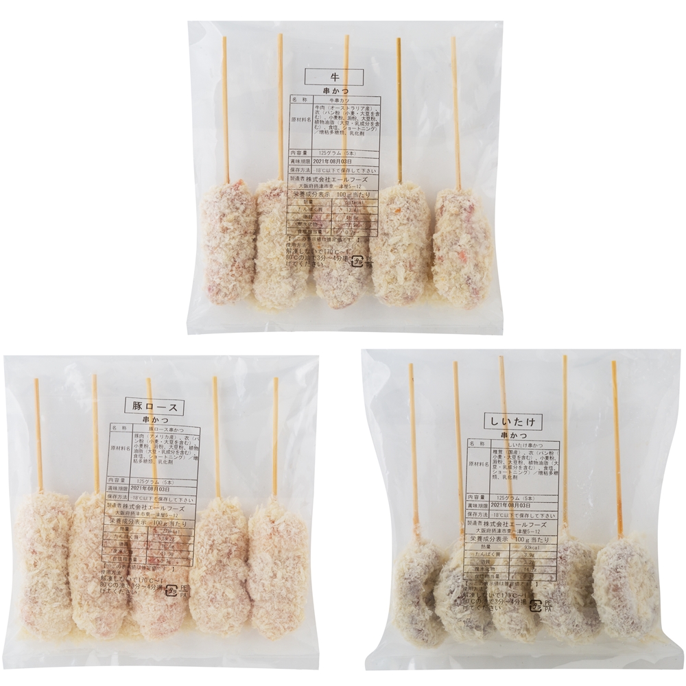 内容:豚肉ロース串カツ×各5本 (各 計125g)、牛串カツ×5本(計125g)、椎茸串カツ×5本(計125g) (3種・計15本)