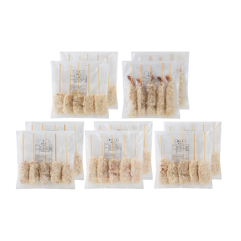 内容:豚肉ロース串カツ×5本(計125g)×2、牛串カツ×5本(計125g)×2、鶏肉ムネ串カツ×5本(計150g)×2、エビ串カツ×5本(計110g)×2、イカ串カツ×5本(計150g)×2 (5種・計50本)