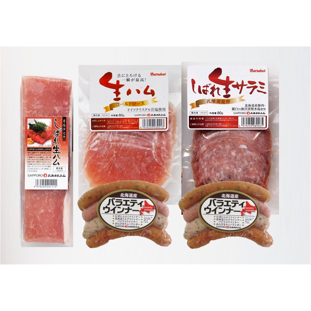 内容:しばれ生ハム冊取200g、コールドロース(しばれ生ハム)スライス80g、しばれ生サラミスライス80g、北海道産バラエティウインナー4種100g×2