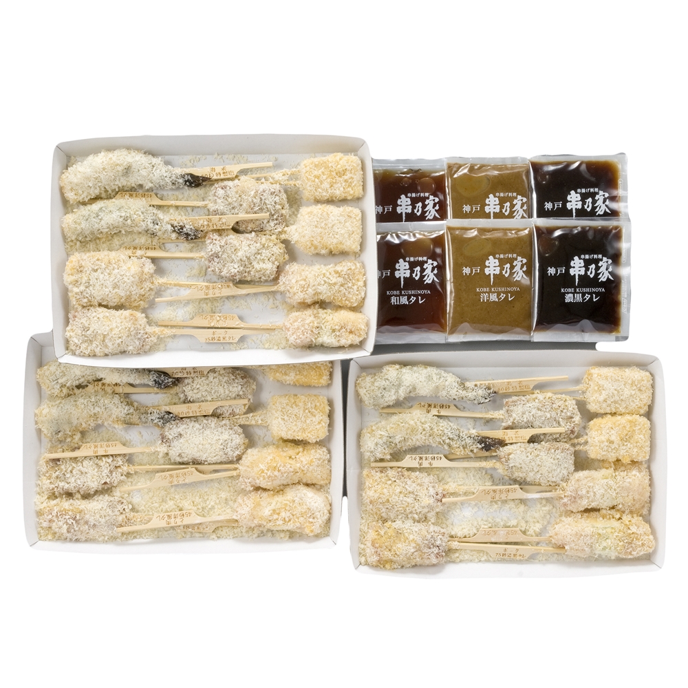 内容:串揚げ5種 計30串 (海老×6、洋風蒸し×6、ポークヒレ×6、鶏肉むね肉白葱×6、神戸牛×6) 、特製タレ3種各×2(濃黒タレ、和風タレ、洋風タレ)