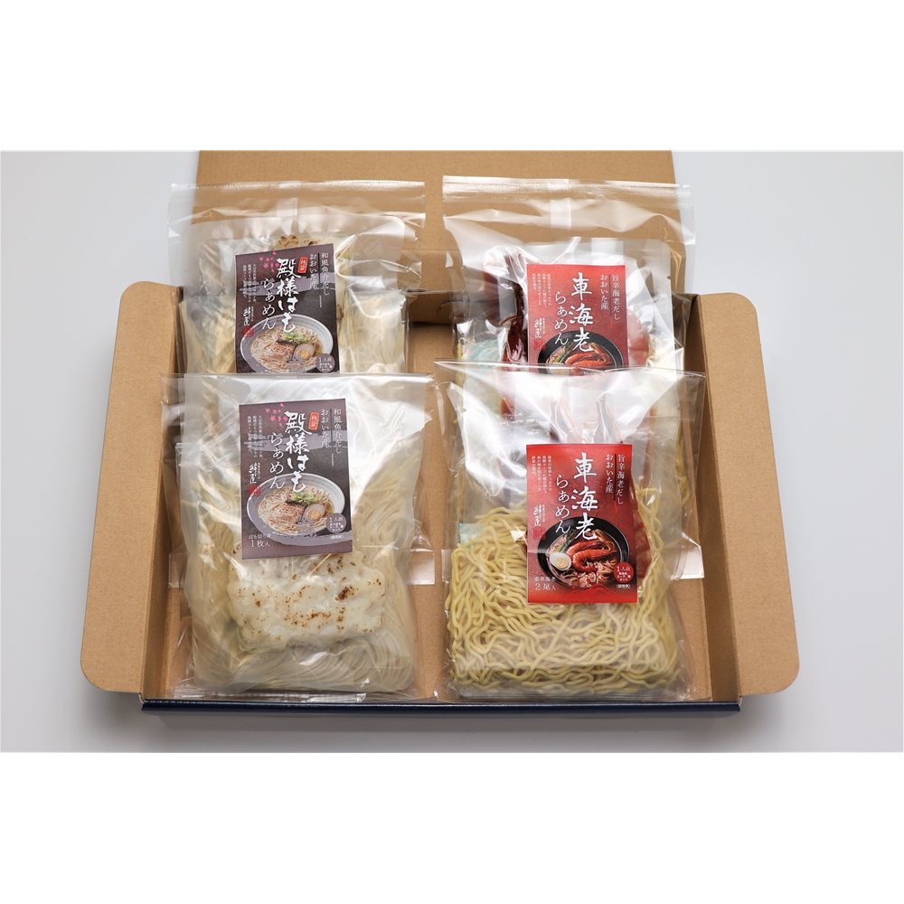 内容:(車海老2尾、ちぢれ麺100g、旨辛えびだしスープ80g)×2、(殿様はも切身1枚、ストレート麺100g、和風魚介だしスープ80g)×2