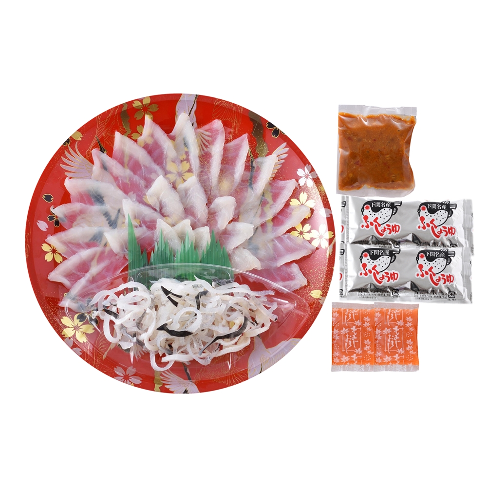 内容:とらふぐ刺身(22cm皿)40g、とらふぐ皮20g、味噌うに50g、ふく醤油30ml×2、もみじおろし10g×2
