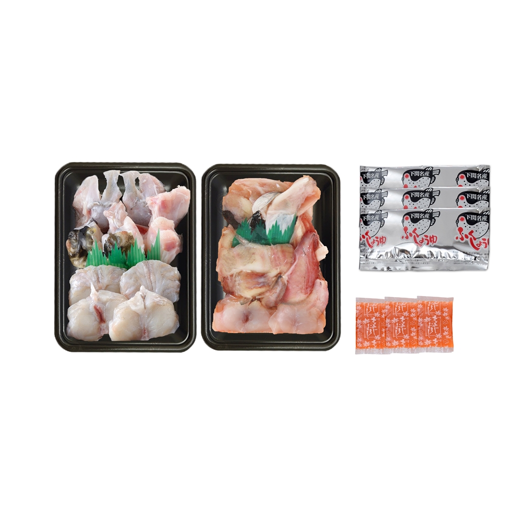 内容:とらふぐちり(切身、アラ)250g、あんこう250g、ふく醤油30ml×3、もみじおろし10g×3