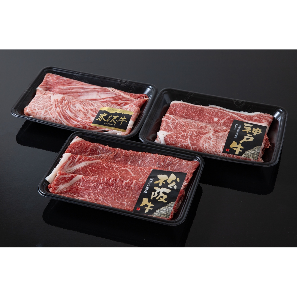 内容:松阪牛(もも)すきしゃぶ用、神戸牛(肩ロース・肩・バラ)すきしゃぶ用、米沢牛(肩ロース・肩・バラ)すきしゃぶ用 各200g×各1