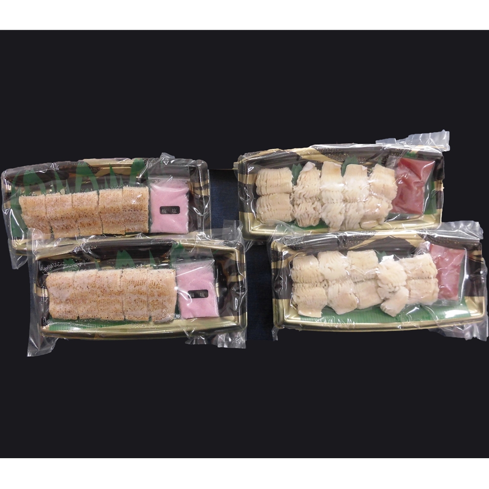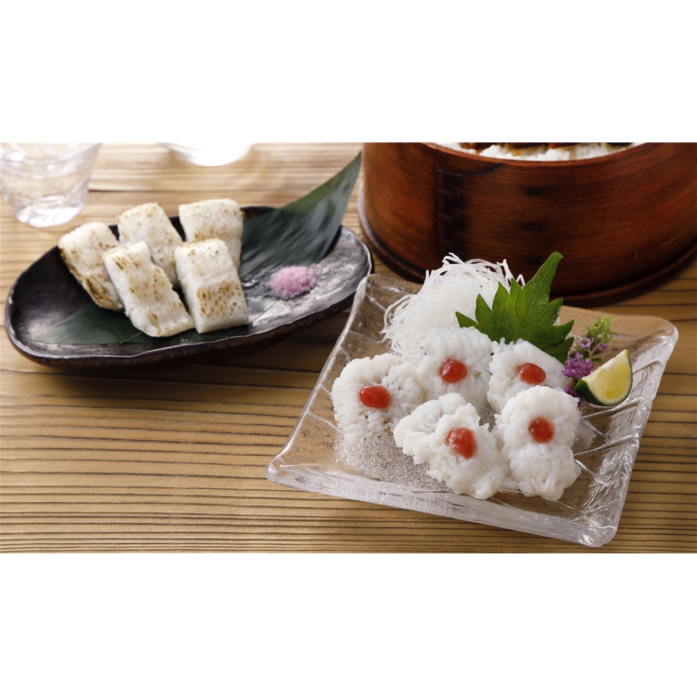 内容:はも湯引き50g×2(梅肉付き)、あぶり鱧(梅塩付き)50g×2