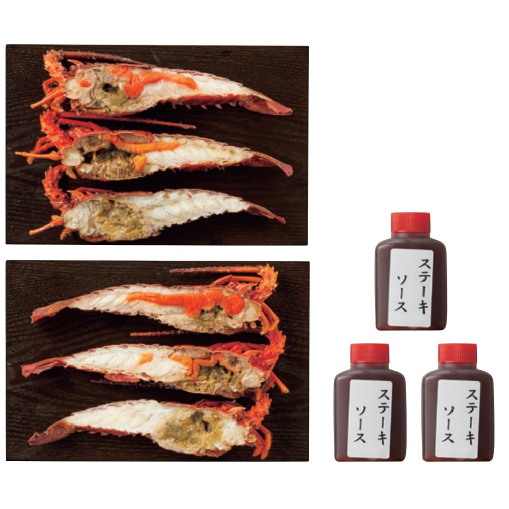 内容:伊勢海老ハーフカットステーキ片身6切、ステーキソース20g×3 (伊勢海老原料1尾150g~200g)