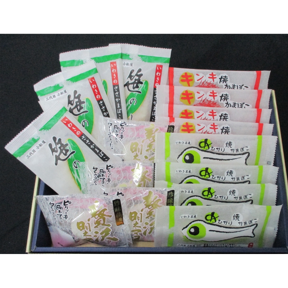 内容:珍味蒲鉾贅沢明太マヨ×4個、笹のしずく×4枚、めひかり焼かまぼこ×4枚、キンキ焼かまぼこ×4枚