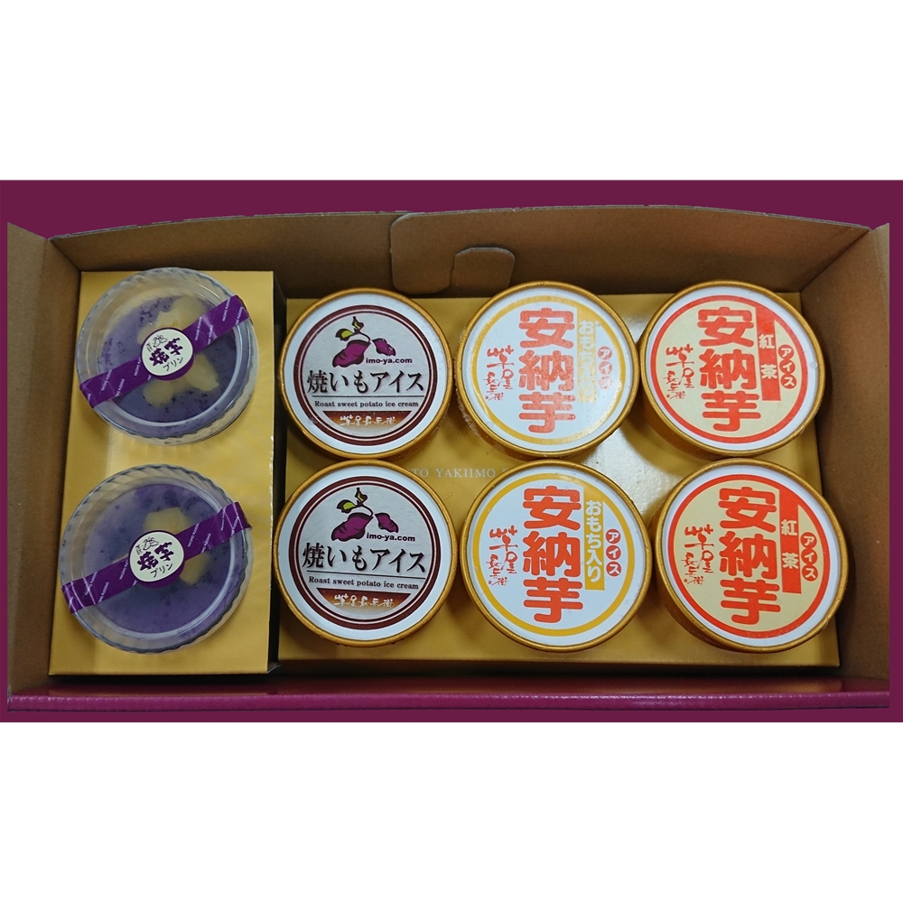 内容:焼芋プリン120ml×2、焼いもアイス75ml×2、安納芋アイス(おもち・紅茶)各90ml×各2