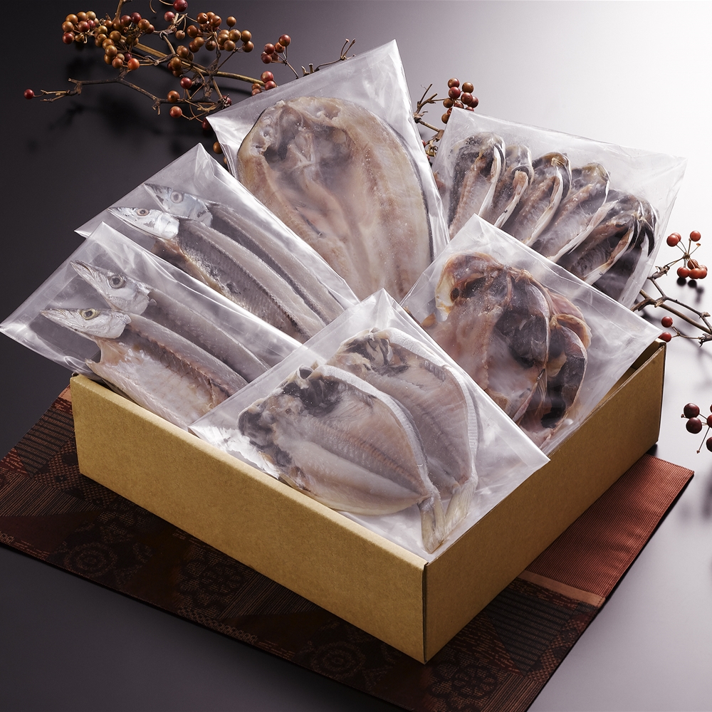 内容:真あじ開き6枚(計360g)、かます開き2枚(計160g)、さんま開き2枚(計180g)、えぼ鯛開き2枚(計180g)、金目鯛開き2枚(計180g)、ほっけ開き1枚(200g)