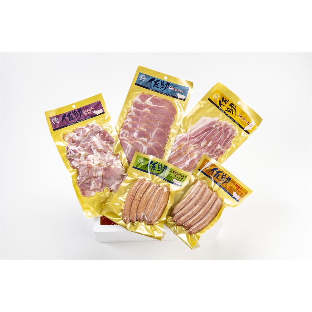 内容:ベーコン200g、ショルダーベーコン200g、粗挽きウィンナ150g、ニンニクウィンナ150g、ボンレスハム150g