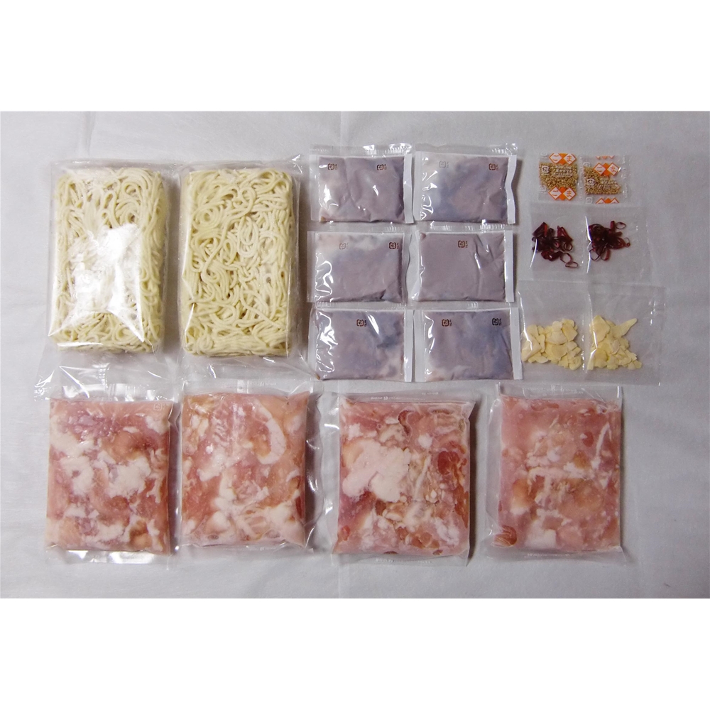 内容:牛もつ肉(国内産)100g×4袋、ちゃんぽん麺180g×2玉、にんにく 3g×2袋、唐辛子0.5g×2袋、白ごま0.7g×2袋、もつ鍋用濃縮とんこつスープ36g×6袋