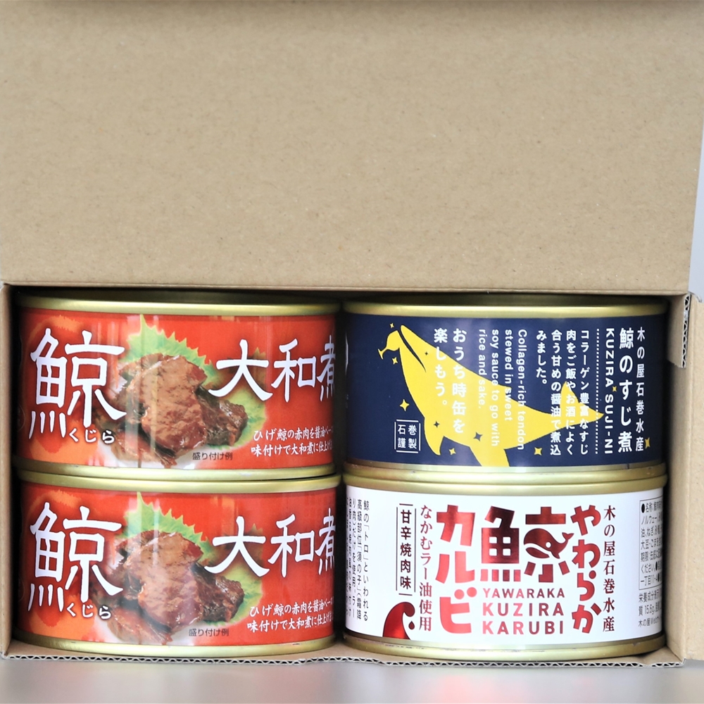 内容:鯨大和煮170g×2、やわらか鯨カルビ(甘辛焼肉味)150g・鯨のすじ煮(醤油味)150g×各1缶