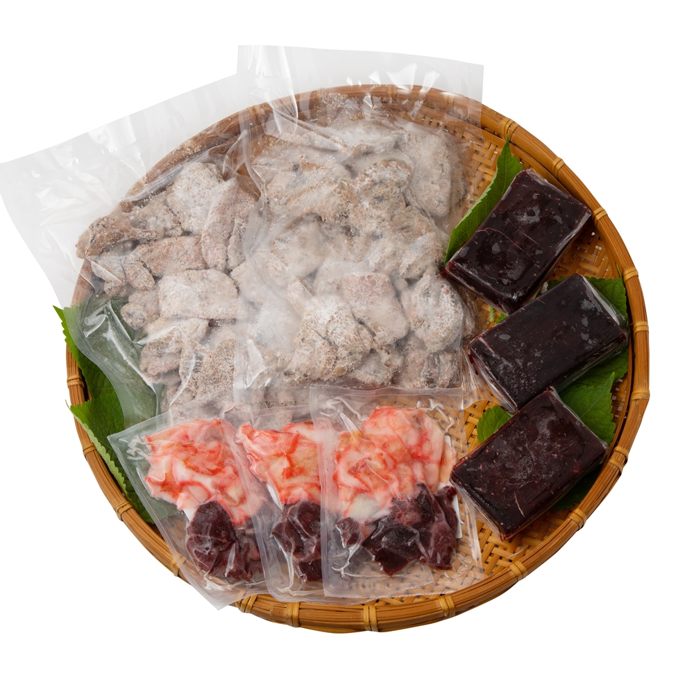 内容:くじらベーコン80g×2(国産またはノルウェー産)、鯨竜田揚げ500g×2 (IQF凍結、国産またはノルウェー産)、ミンク鯨赤肉1級200g×3(国産またはノルウェー産)