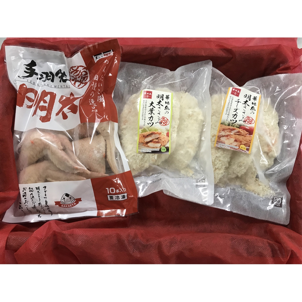 内容:手羽先明太子10本入り(550g)×1、明太ささみ大葉カツ(100g×3切)×1、明太ささみチーズカツ(100g×3切)×1