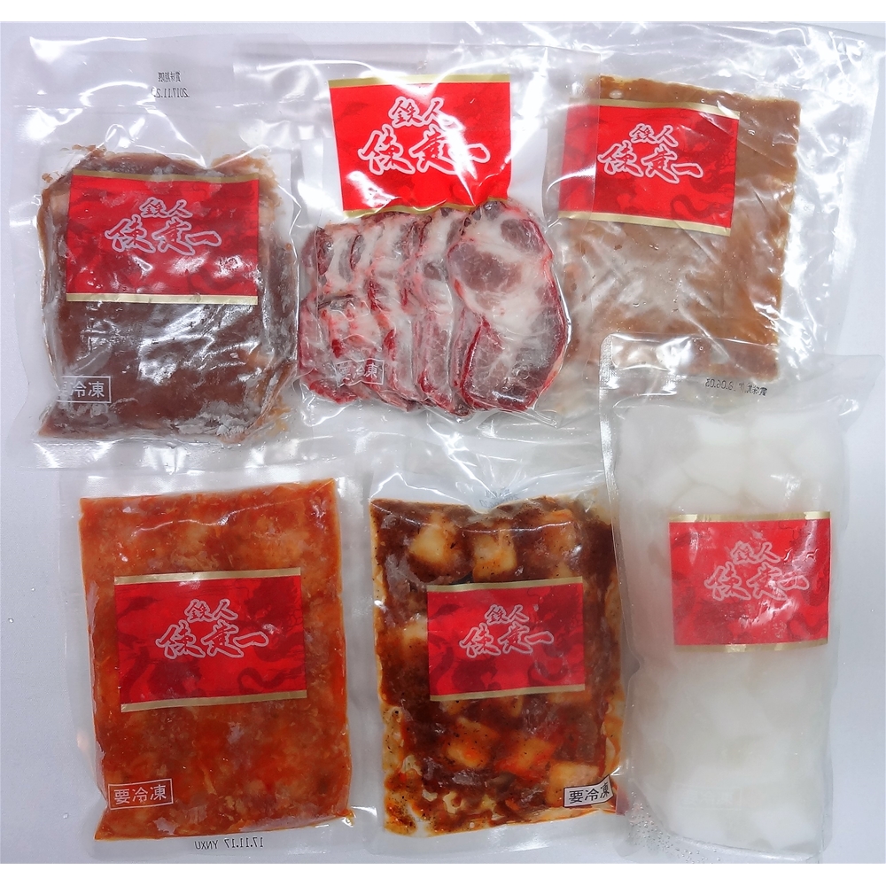 内容:大エビチリソース150g、本格四川麻婆豆腐150g、東坡肉150g、棒々鶏肉セット150g、焼豚肉スライス100g、杏仁豆腐500g×各1