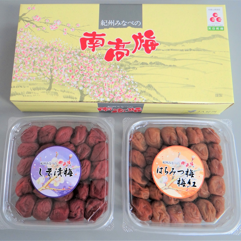 内容:紀州みなべの南高梅しそ漬梅干450g(塩分13%)、 紀州みなべの南高梅はちみつ漬梅干450g(塩分8%)
