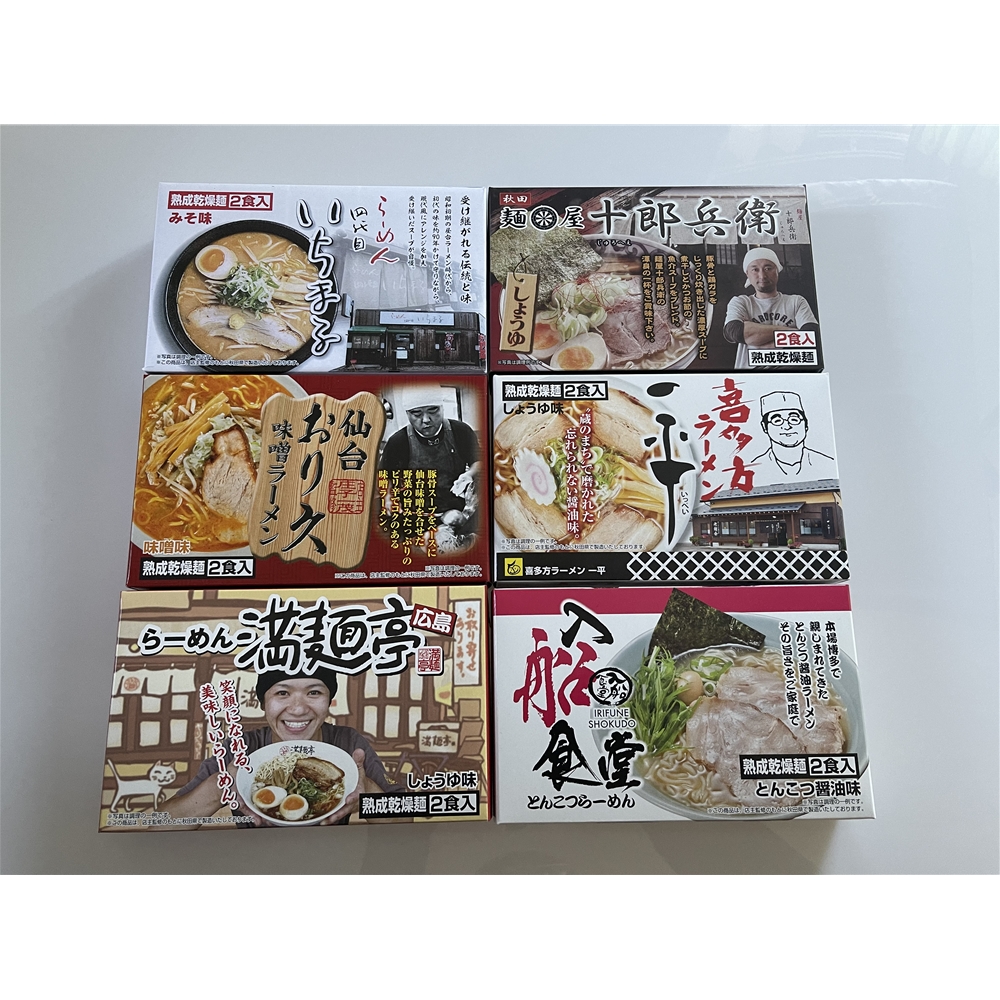 内容:札幌「四代目いちまる」味噌味×(麺70g、スープ50g)×2、秋田「十郎兵衛」醤油味(麺70g、スープ42g)×2、仙台「おり久」辛みそ味(麺70g、スープ35g)×2、喜多方「一平」醤油味(麺70g、スープ40g)×2、広島「満麺亭」醤油味(麺70g、スープ45g)×2、博多「入船食堂」とんこつ味(麺70g、スープ50g)×2