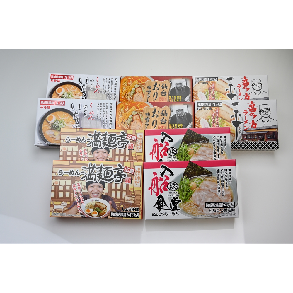 内容:札幌「四代目いちまる」味噌味×2箱(1箱あたり麺70g×2、スープ50g×2入)、仙台「おり久」辛みそ味×2箱(1箱あたり麺70g×2、スープ35g×2入)、喜多方「一平」醤油味×2箱(1箱あたり麺70g×2、スープ40g×2入)、広島「満麺亭」醤油味×2箱(1箱あたり麺70g×2、スープ45g×2入)、博多「入船食堂」とんこつ味×2箱(1箱あたり麺70g×2、スープ50g×2入)