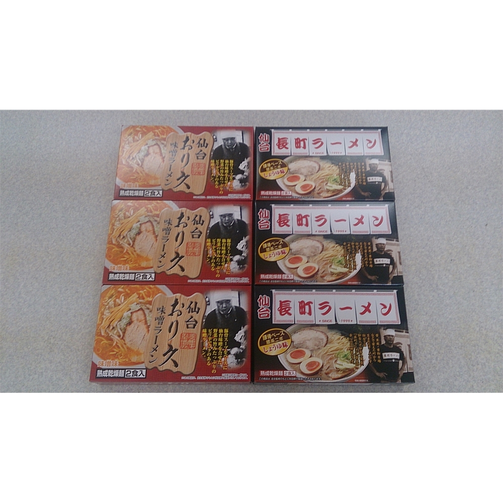 内容:仙台「おり久」味噌味×3箱(1箱あたり麺70g×2、スープ35g×2入)、仙台「長町ラーメン」醤油味×3箱(1箱あたり麺70g×2、スープ45g×2入)
