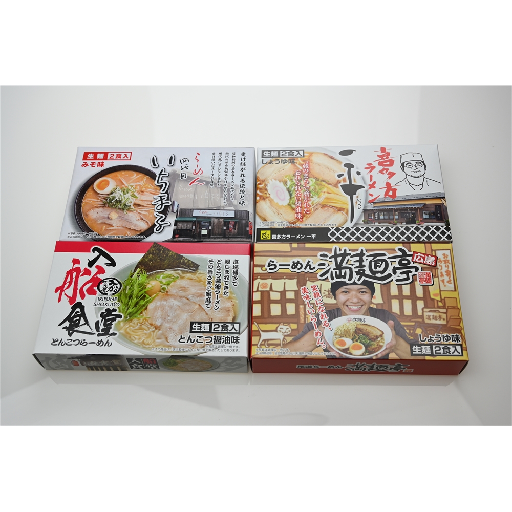 内容:札幌「四代目いちまる」味噌味×1箱(1箱あたり麺120g×2、スープ50g×2入)、喜多方「一平」醤油味×1箱(1箱あたり麺120g×2、スープ40g×2入)、博多「入船食堂」とんこつ味×1箱(1箱あたり麺120g×2、スープ50g×2入)、広島「満麺亭」醤油味×1箱(1箱あたり麺120g×2、スープ45g×2入)