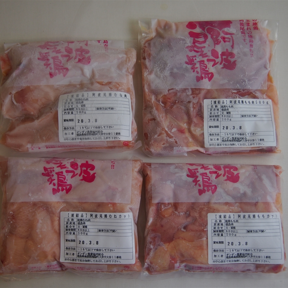 内容:阿波尾鶏肉もも肉500g、阿波尾鶏肉もも切り身500g、阿波尾鶏肉ムネ肉500g、阿波尾鶏肉ムネ切り身500g