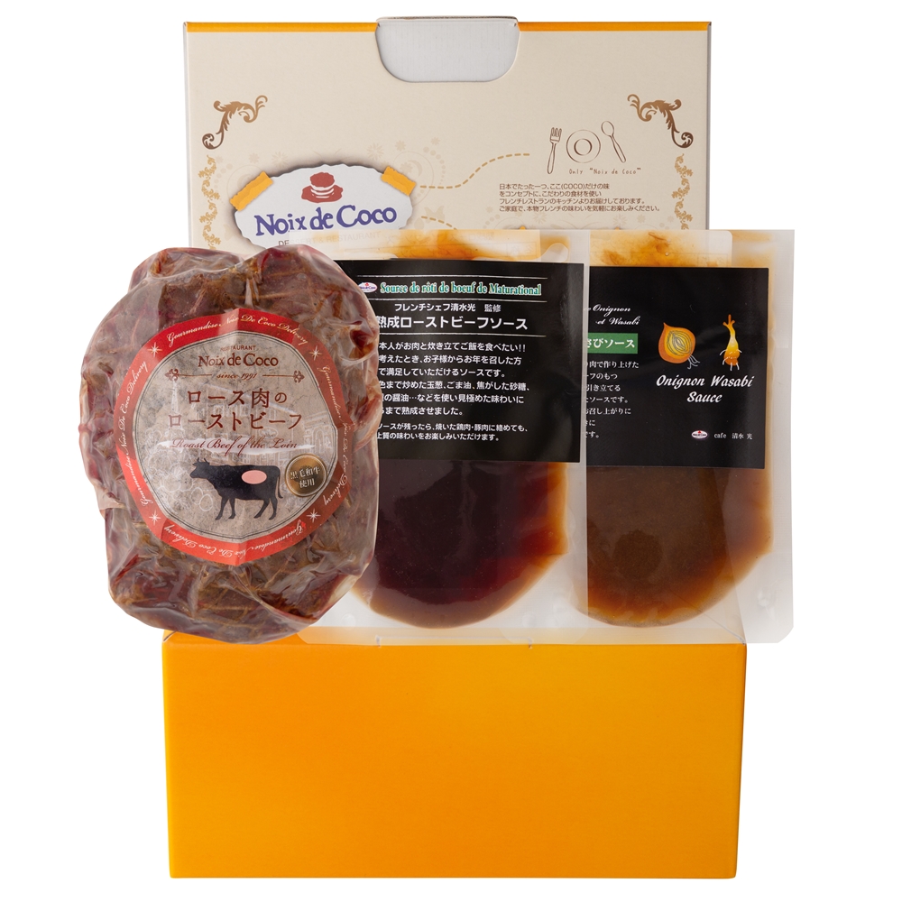 内容:黒毛和牛ロースのローストビーフ300g、熟成ローストビーフソース60ml、玉ねぎわさびソース50ml