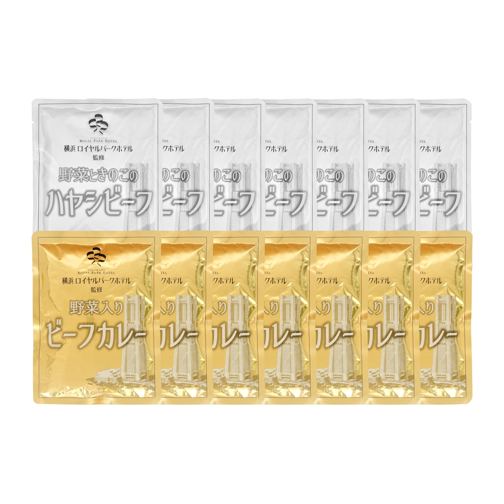 内容:野菜入りビーフカレー200g×7、野菜ときのこのハヤシビーフ180g×7