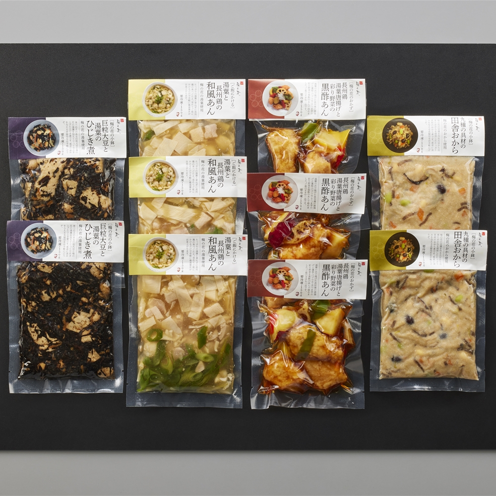 内容:九種の具材の田舎おから煮150g、巨粒大豆と湯葉のひじき煮150g×各2、湯葉と長州鶏肉の和風あん150g、長州鶏肉湯葉唐揚げと彩り野菜の黒酢あん150g×各3