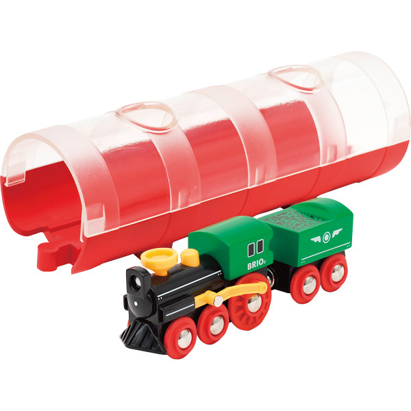 クラシックな蒸気機関車です。車輪の動きに合わせて黄色のパーツが動きます。パッケージはシースルートンネルとしても使うことができます。