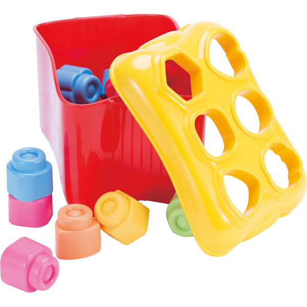 内容:対象年齢:6ヶ月~、シングル(四角)ブロック8個、ハートブロック・丸ブロック・三角ブロック・お花ブロック・六角形ブロック各2個、フタ付ボックス