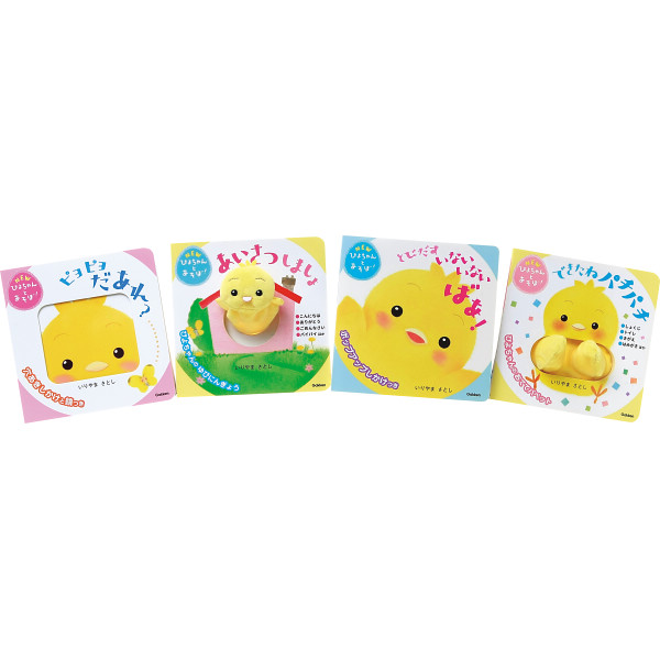 世界累計1000部以上と、世界中のお子さまに人気のぴよちゃんシリーズからNEWぴよちゃんとあそぼ!4冊『あいさつしましょあいさつしましょ』『できたねパチパチ』『とびだすいないいないばあ!』『ピヨピヨだあれ?』をセレクト!『あいさつしましょ』ふわふわ可愛いぴよちゃん指人形つきの絵本。「ありがとう」「ごめんなさい」など気持ちを伝える大切な言葉を覚えましょ。『できたねパチパチ』ぴよちゃんの羽に指を入れて動かせる素材つき絵本。トイレ、はみがき…できたらパチパチ拍手!ぴよちゃんがほめてくれます。『とびだすいないいないばあ!』ページを開くと、ぴよちゃんや動物たちが隠していたお顔を「ばあ!」と見せるしかけつき。とびだすしかけ絵本。『ピヨピヨだあれ?』動物の鳴き声と、窓からちら見えの動物の顔であてっこ遊びを楽しむ穴あきしかけ絵本。赤ちゃん大好き鏡つき!