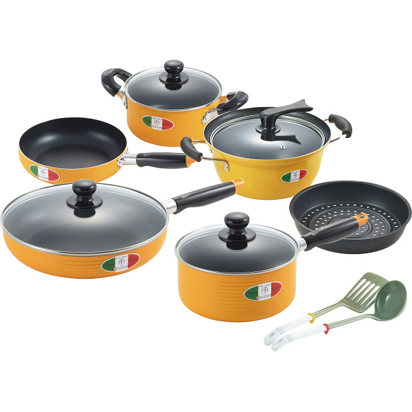 内容:(片手鍋18cm)=容量約2.05l(深さ約8cm)、フライパン26cm=深さ約5.3cm、両手鍋18cm=容量約2l(深さ約8cm)、フライパン20cm=深さ約5cm、深型マルチポット24cm=容量約5.3l(深さ約9.7cm)、目皿・お玉・ターナー付、ガスコンロ可、100・200V電磁調理器対応