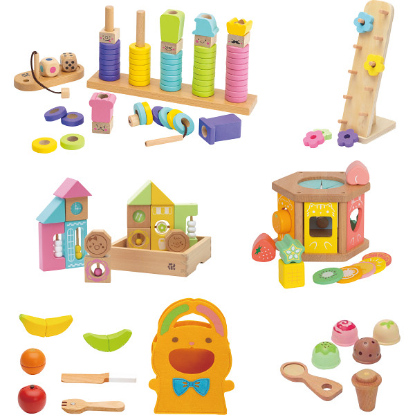 ウッディプッディの知育のおもちゃとおままごとがセットになりました。型はめやつみき、棒通し、カタカタおとしなどの知育と磁石でくっつくおままごとも遊べます。